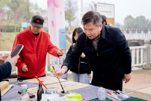 本次活动以“文化传承”与“情感凝聚”为核心,将传统文化与美育实践深度融合。“松鹤樱吟雅集处”内,前辈们即兴挥毫,以樱花为媒书写诗词、创作书画,佳作由工作处收藏并专题展示。“觅句亭”中,大家吟诗作对,前辈现场赋诗:“夕阳老人不服老,樱花丛中忆芳华”、“星空日月同洁净,山水楼桥共清新”等诗词锦句,抒发了对学校蓬勃发展的赞誉。现场还设置了宣扇绘制与汉服拍摄体验区,前辈们在笔墨丹青与古韵服饰中,感受传统文化之美。